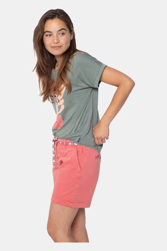- Verder heeft de korte broek een placket met houten knopen en opgerolde pijpen.