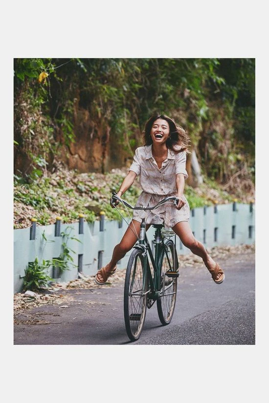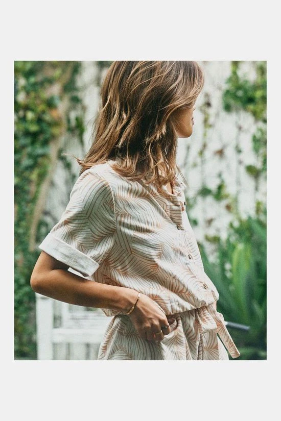 - De playsuit heeft een overhemdkraag en knopen van kokosnoot aan de voorzijde.